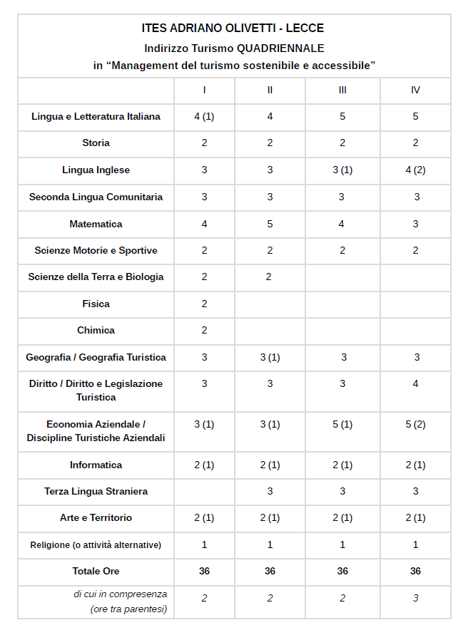 Descrizione e Quadro Orario dell'Indirizzo Quadriennale Turismo in "Management del turismo sostenibile e accessibile"